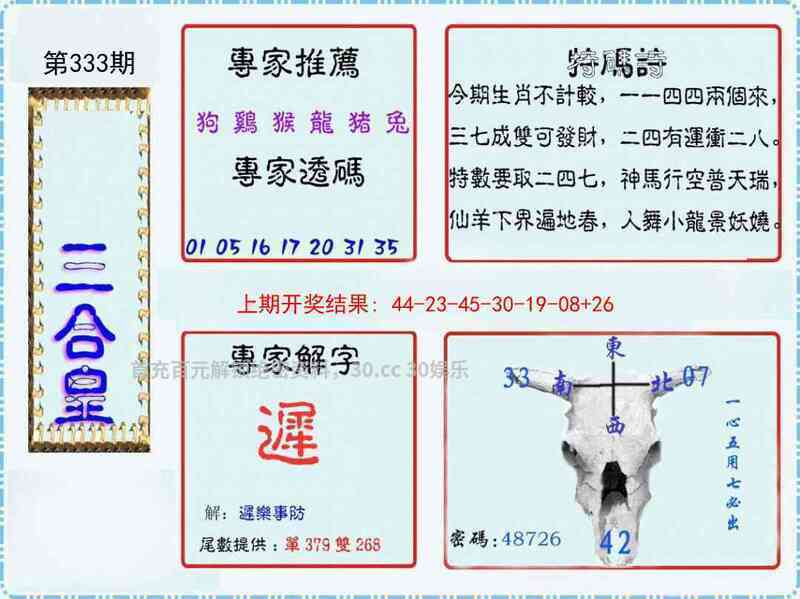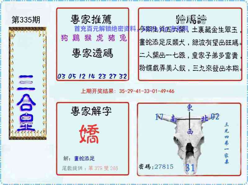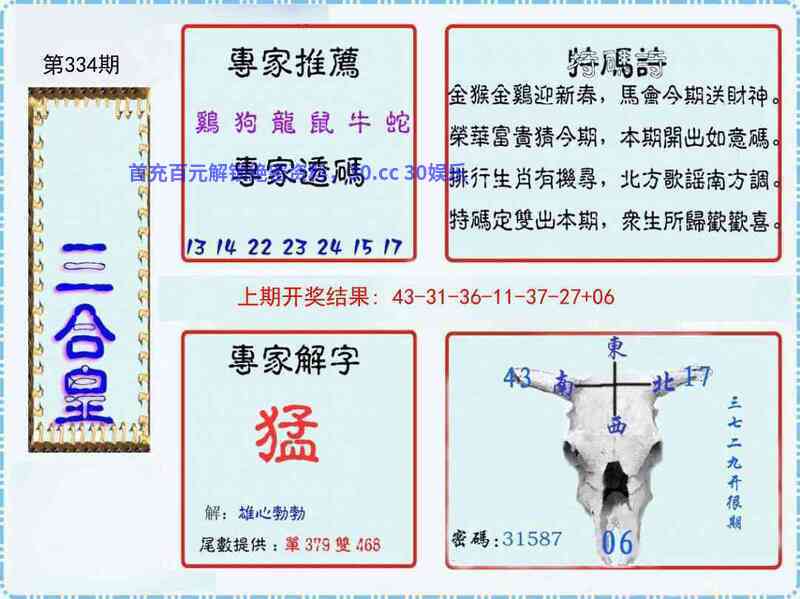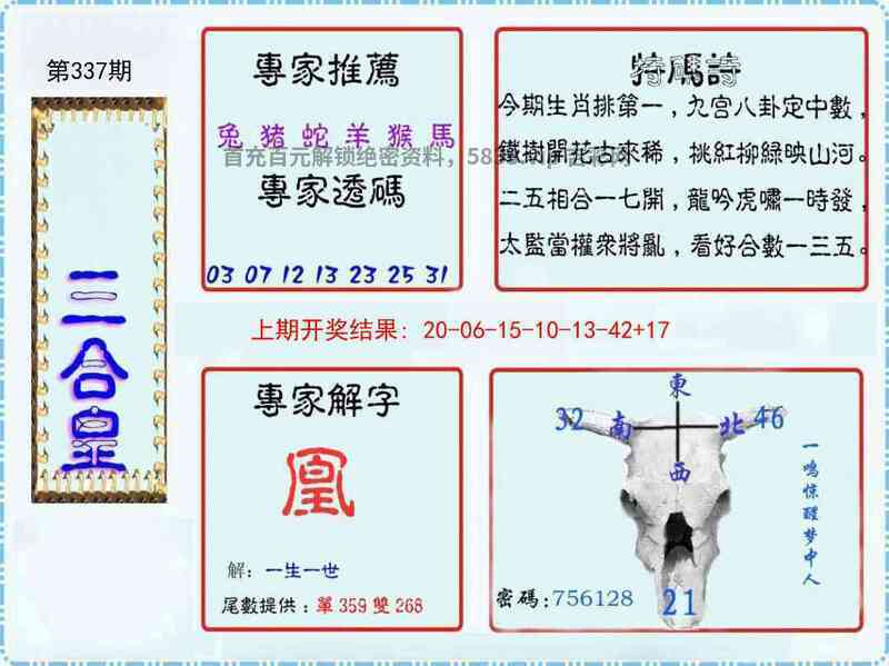 【解三合皇图】开:發00 338期特码诗:今期特門一二七,湖中荷花出污泥,雙數有碼藍波定,一言九鼎是君王。四六合一先後出,三七相逢做大戲,小姐夫人赏桂花,近水樓臺先得月。 【专家推荐】龙羊虎蛇兔鼠 【专家透码】05.07.24.38.11.34.46 ![]() |